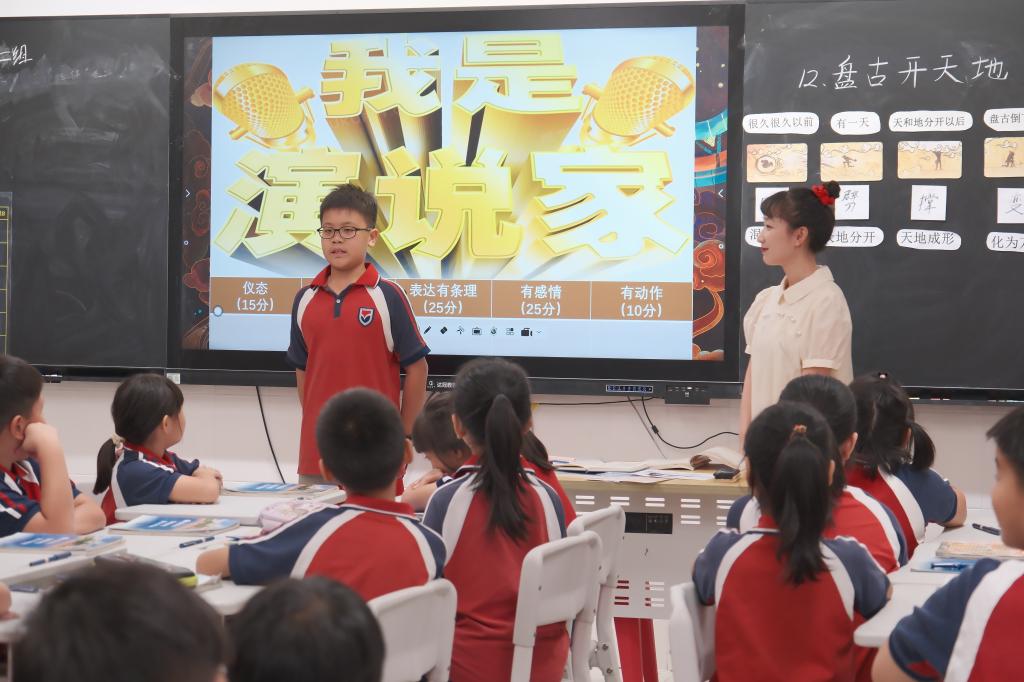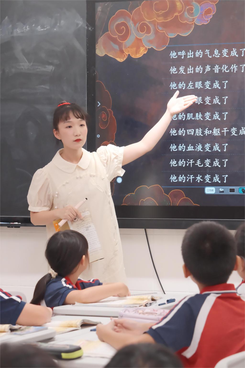 江雨晴老师上的是《盘古开天地》,本节课围绕单元要素“感受神话中的神奇想象和鲜明的人物形象”展开,从第一自然段教学生通过分析人物形象感受神话的神奇之处,到小组合作学习第二自然段,再到放手让学生自学三四自然段,实现“教-扶-放”的过程,最后引导学生想象盘古化为万物的神奇画面,体会盘古勇于献身的精神。