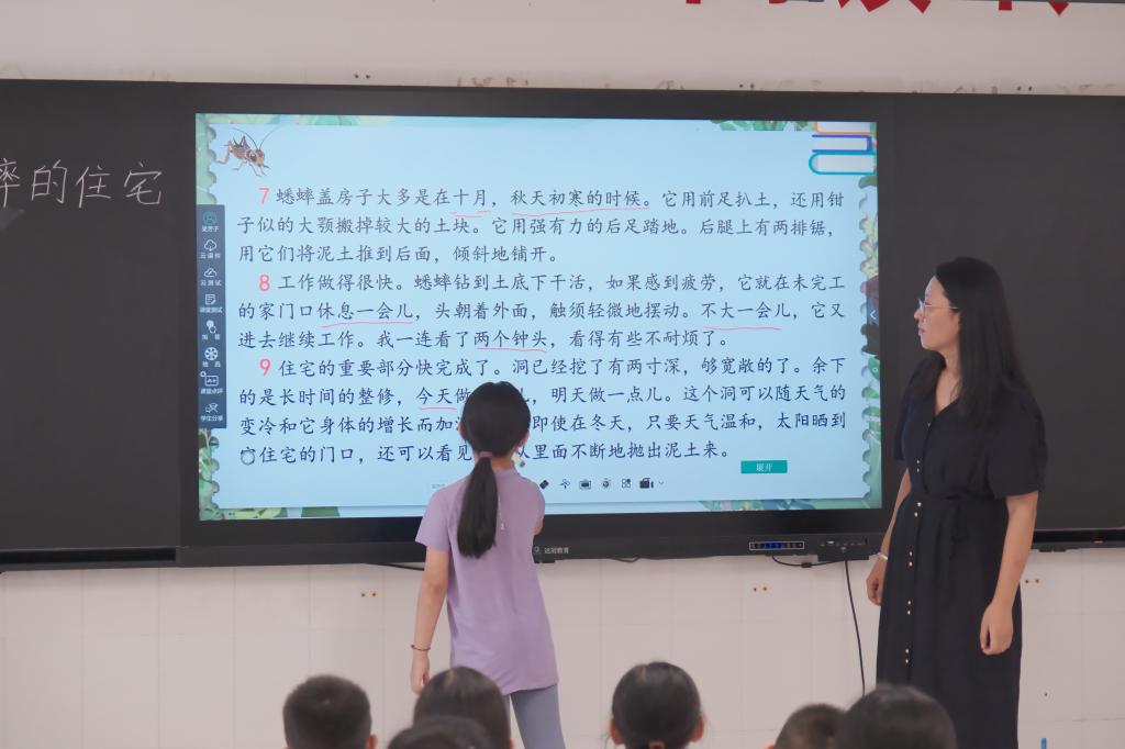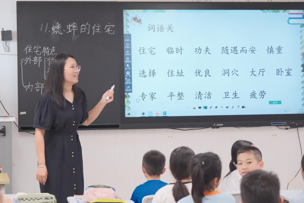 吴芳子老师上的是《蟋蟀的住宅》,“体会文章准确生动的表达,感受作者连续细致的观察”是四上第三单元的语文要素,这节课的教学设计就是紧紧围绕语文要素展开。这节课她采用了情境教学,创设人人争当蟋蟀住宅代言人的情境展开教学。教学中,吴老师运用多种教学策略,以问题为导向,引导学生圈画出关键词句,以小组合作交流的形式,将文本圈画的重点内容通过自己的语言讲出来。最后让学生用自己的话说一说蟋蟀住宅的特点及修建过程,体会蟋蟀住宅确实是“伟大的工程”。此外,通过蟋蟀修建住宅的时间之长感受蟋蟀的精神,引导学生感受作者连续细致的观察,感受法布尔对昆虫的热爱,对生命的赞美。