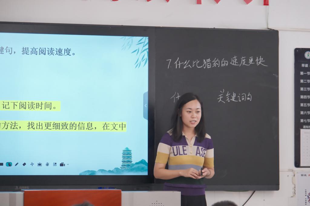 熊章华老师执教的是五年级上册的《什么比猎豹的速度更快》,熊老师善于运用鼓励的语言,让整堂课如沐春风。她善于引导学生从课题的解读入手,找准关键点,循着目标一步步突破课堂的学习重点,通过及时有效的课堂练习,学生们掌握了提高阅读速度的方法。