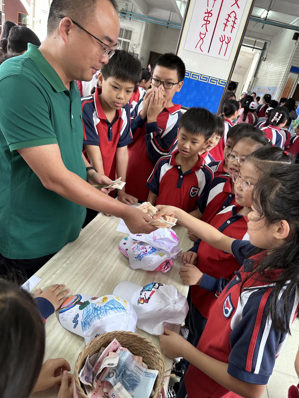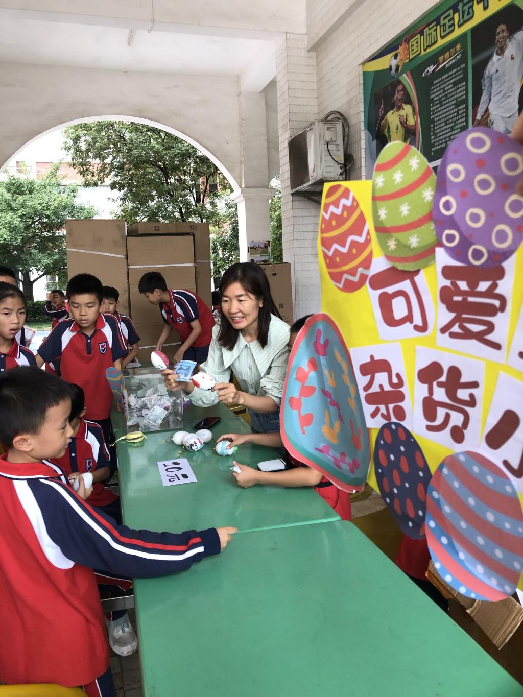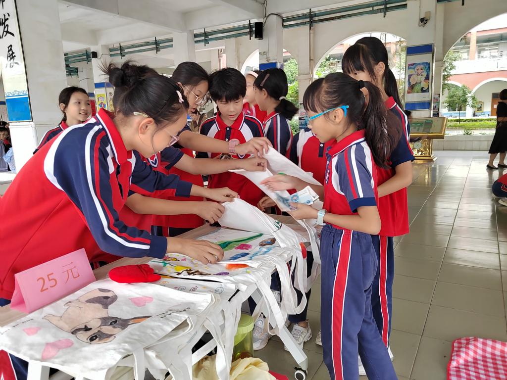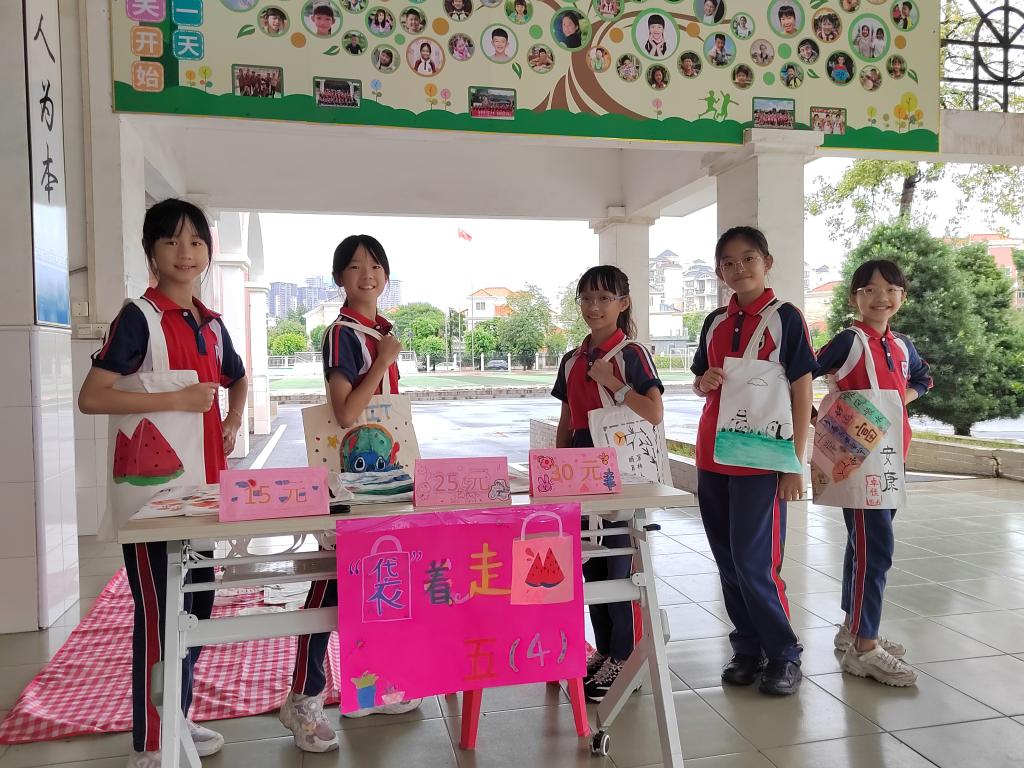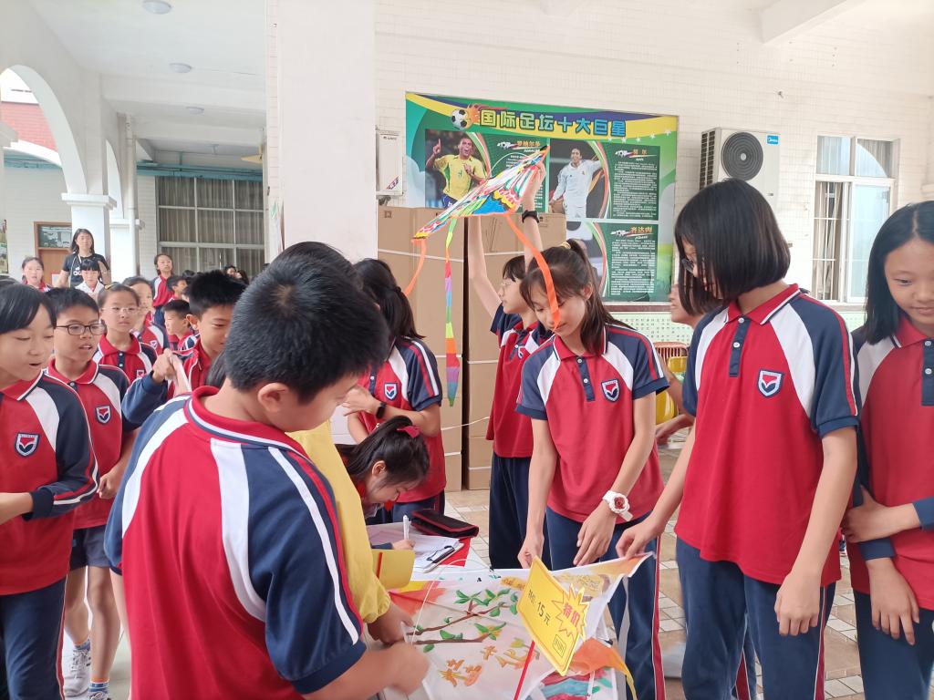 集市活动前,各班同学用心设计海报,给作品标价,布置摊位。活动中一个个销售员热情地站在摊位前,不停地吆喝宣传,耐心细致地为前来看商品的顾客讲解,还有些销售员拿着作品走到人群中大力推销。