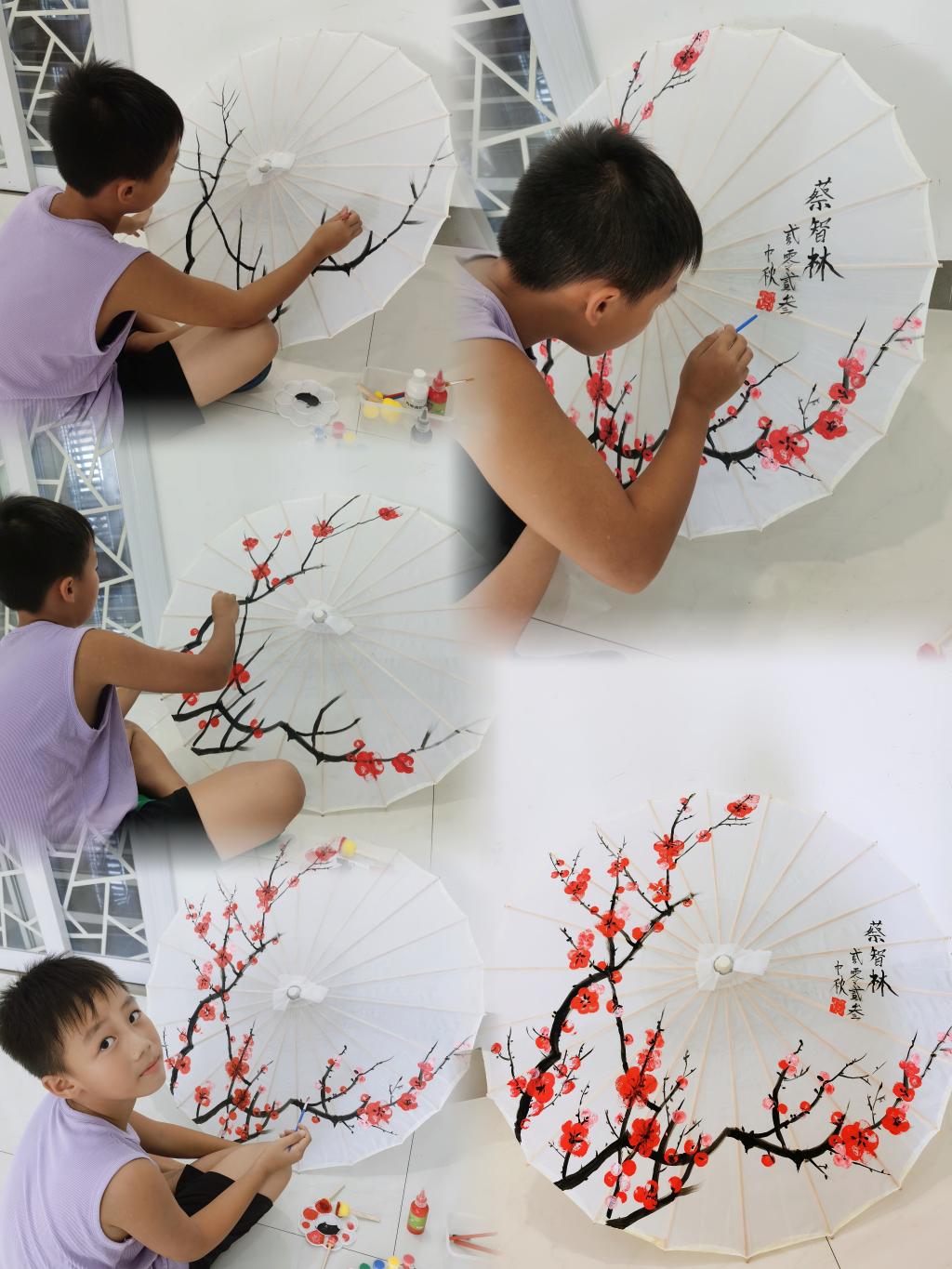 油纸伞作为中华民族传统艺术,展现着中华传统文化的优雅,在中国已有千年历史,是中国古人的智慧结晶。四年级的学生们充分发挥艺术想象力和绘画技巧,用水彩将美丽纷繁的图案晕染,一笔一画勾勒出独具创意的画作。学生们在动手绘制油纸伞的过程中感受了古老传统技艺的魅力,一把把素洁的油纸伞也被赋予了全新的意义和价值。油纸伞绘制活动的开展,不仅加深了学生们对传统文化的认识和了解,也将美育融于学生的生活中,真正让“五育并举”落地生根。