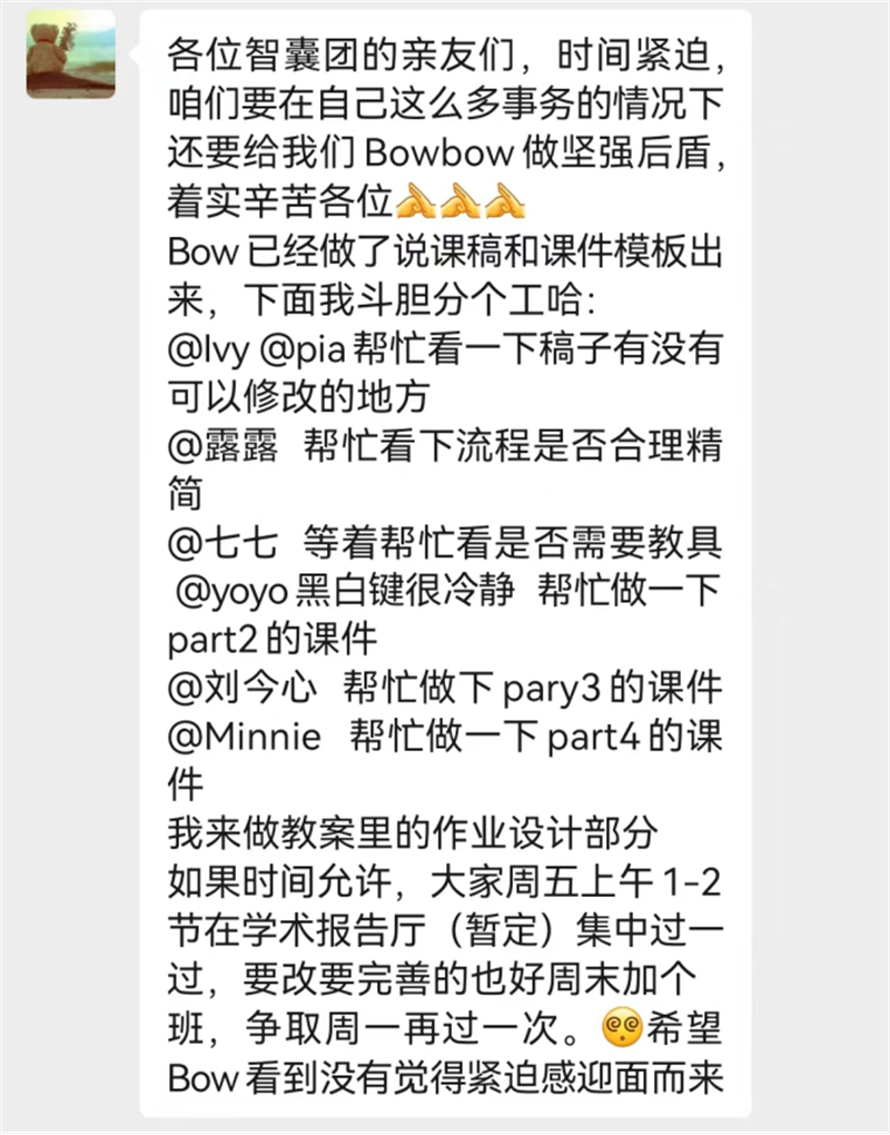 一、群策群力,力求完美。说课比赛结束后,距离提交教学设计和课件的时间仅剩10小时。时间紧,任务重,智囊团可谓是与时间赛跑呀。团员们从头脑风暴到敲定教学设计,完善教学设计的每一部分的内容,再到制作课件,不停地修改、完善课件的每一个细节、每一个呈现,最终得以在10点前提交教学设计和课件等材料。随后,大家便快马加鞭地制作学具和教具,熊组长负责学生用书的排版、打印和装订,几百张白纸经过她的巧手变成了一本又一本装订精美的彩色小绘本。擅长板书设计的吴老师负责板书制作,一张张卡纸在她的手下变成了色彩搭配协调的图画和词卡。梁老师和何老师便负责搜索板书需要的素材和板书的过塑、粘贴。智囊团一行人往返于办公室和文印室之间,走廊的感应灯不停地亮起又熄灭,而灯火通明的办公室内,谢主任和钟老师两人在梳理教学环节,逐字逐句地优化课堂语言,模拟课堂生成。