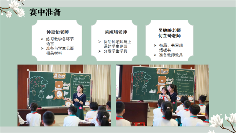 二、万事俱备,站稳三尺讲台。比赛当天,钟老师在候考室内练习教学各环节的语言,准备与学生见面的材料,梁老师则协助钟老师与上课的学生见面,吴老师和何老师则设计和书写现场板书。待学生进入教室后,大家便准备教师的教具,分发学生的学具。随后,钟老师在讲台上尽力绽放,点亮舞台的光芒。