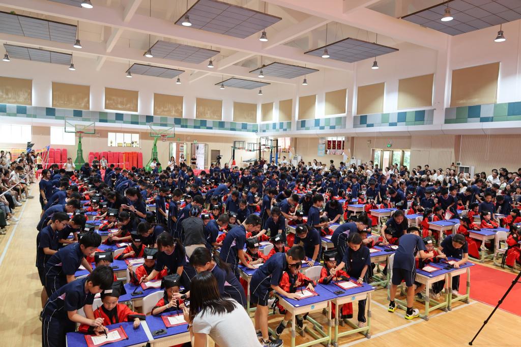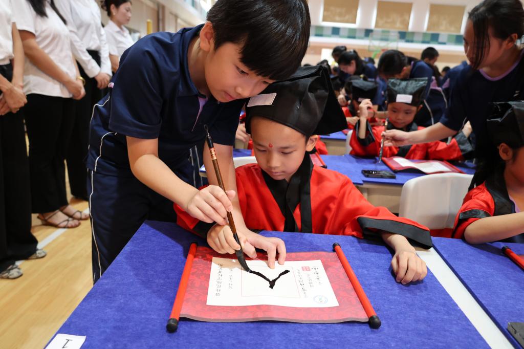 9月19日下午3时,活动在庄重而温馨的开笔礼中达到高潮。五年级学生带领结对伙伴参加这一传统仪式,体验中华文化的深厚底蕴。在老师的指导下,孩子们正衣冠、行拜师礼、朱砂启智、击鼓明志、启蒙描红,每一个环节都蕴含着对知识的尊重和对成长的期待。
