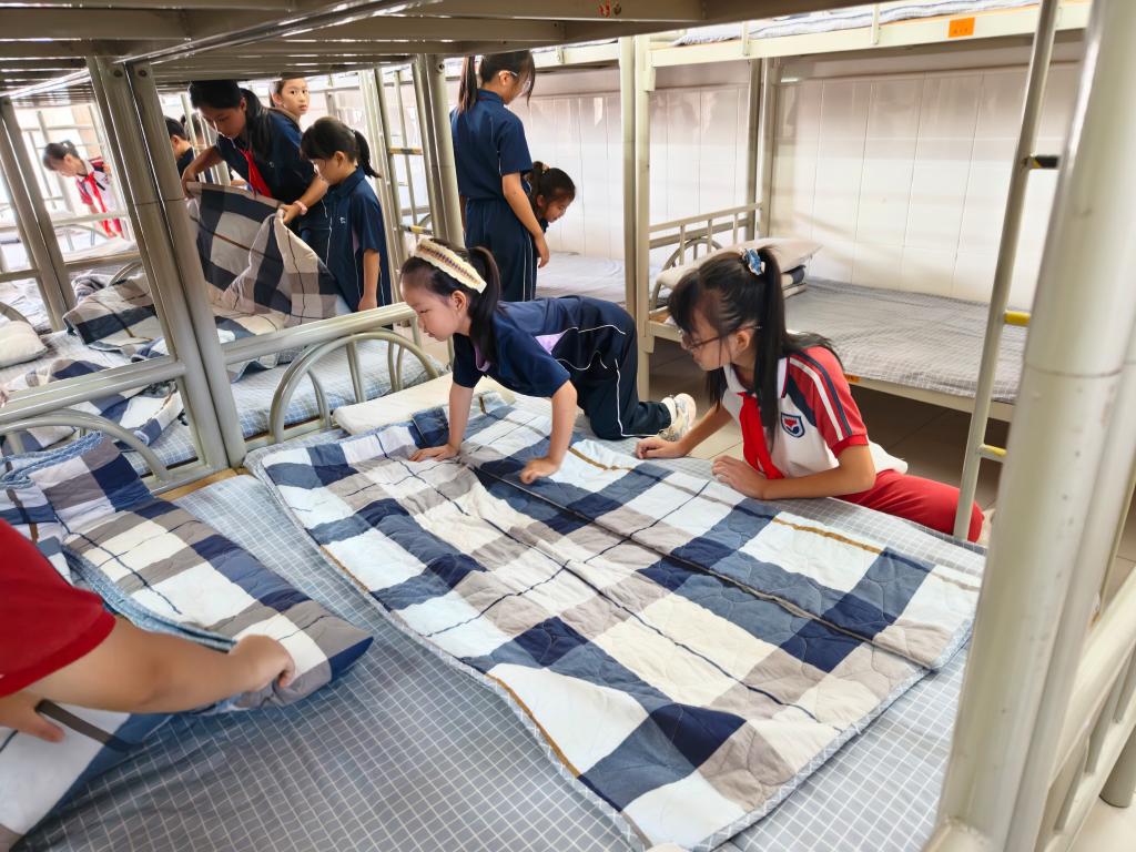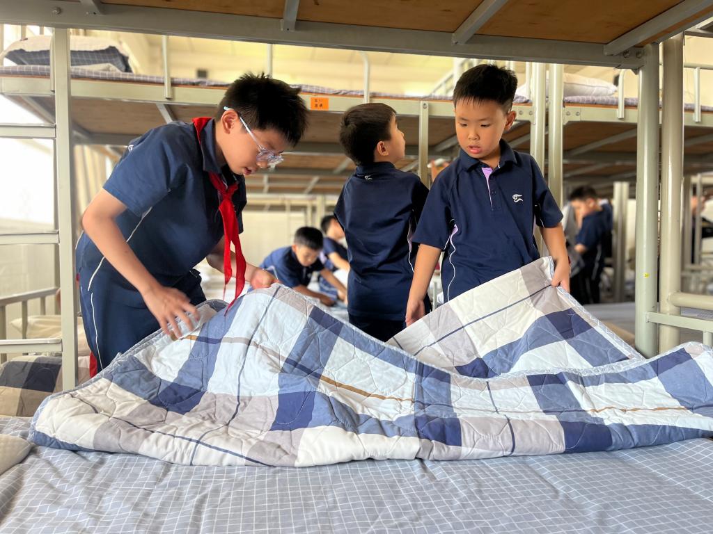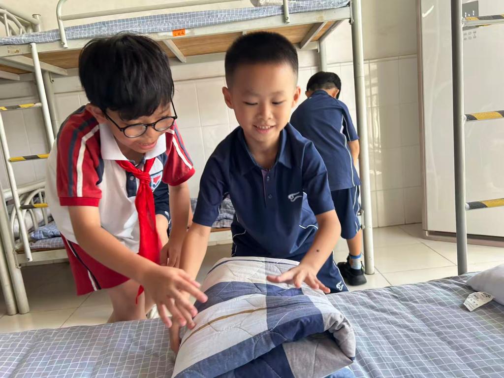 9月8日至15日,活动重点转向良好习惯的培养。在教室里,五年级学生示范如何整理抽屉、摆放桌椅,培养整洁有序的学习习惯;在午休室,他们手把手教授叠被子的技巧,传递生活自理的理念。这些看似简单的技能,对一年级新生来说却是成长路上的重要一课。
