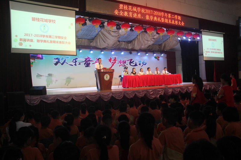 散学典礼是博实乐碧桂花城学校四节五礼的重要组成部分,每当充实而美好的一学期在孩子们的欢笑声中悄悄步入尾声之时,为了更好地总结本学期教育教学工作的成绩和经验,及时表彰在各方面表现出色的优秀学生,鼓励并引导学生走向更好的明天,每学期末博实乐碧桂花城学校全体师生都会在综合馆隆重举行散学典礼,散学典礼包括三个环节:安全教育讲座、校长讲话与期末表彰。
