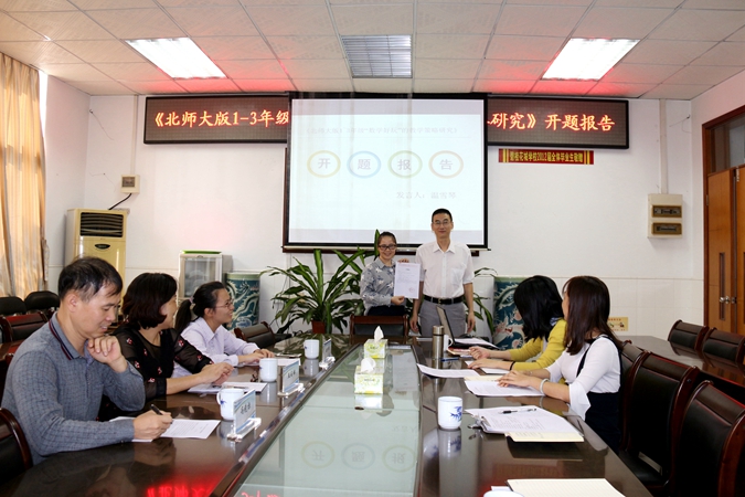 会前,我校学科组长蓝建春先介绍了我校教研课题的成绩,然后通读并颁发了《北师大版1-3年级“数学好玩”的教学策略研究》的立项通知。