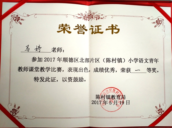 马婷老师在2017年陈村镇小学语文青年教师课堂教学比赛中,荣获一等奖!