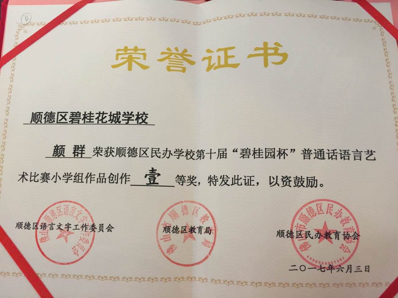 颜群老师荣获顺德区民办学校第十届“碧桂园杯”普通话语言艺术作品创作一等奖!