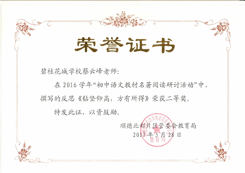蔡云峰老师在顺德北部片区初中语文教材名著阅读研讨活动中撰写的反思获二等奖!