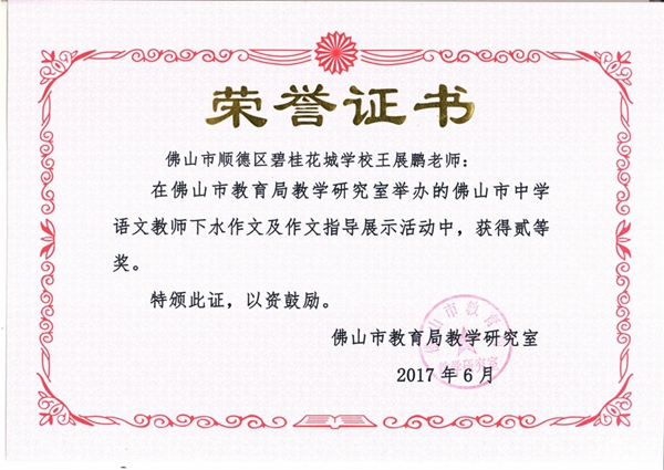 王展鹏老师在佛山市中学语文教师下水作文及作文指导展示活动中荣获二等奖!
