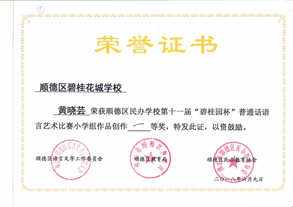 黄晓芸老师荣获顺德区民办学校第十一届“碧桂园杯”普通话语言艺术比赛创作一等奖!