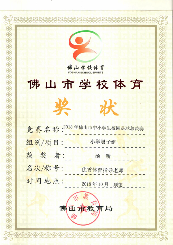 汤新老师在2018年佛山市中小学生校园足球总决赛中被评为优秀体育指导老师!