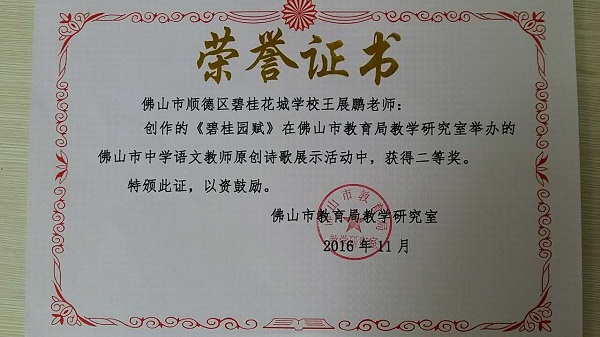 王展鹏老师在佛山语文教师原创诗歌比赛中荣获二等奖