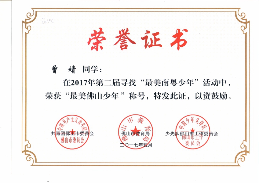曾婧同学荣获“最美佛山少年”称号!