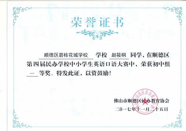 赵筱桐同学在顺德区第四届民办学校中小学生英语口语大赛中,获初中组一等奖!
