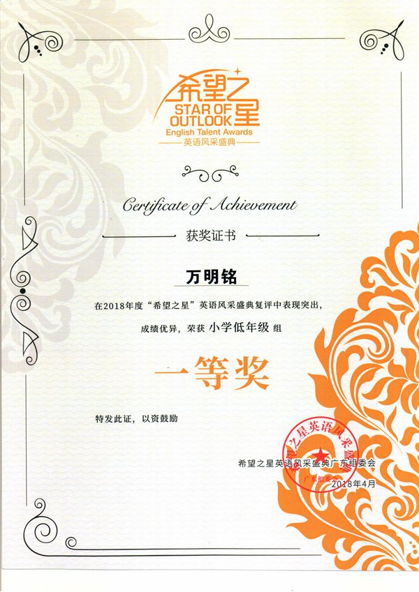 万明铭同学获广东省2018年度“希望之星”英语风采盛典复评一等奖