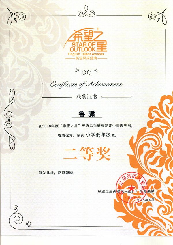 鲁骕同学获广东省2018年度“希望之星”英语风采盛典复评二等奖