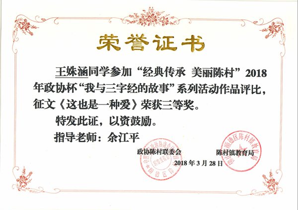 王姝涵同学获陈村镇2018年政协杯“我与三字经的故事”征文比赛三等奖