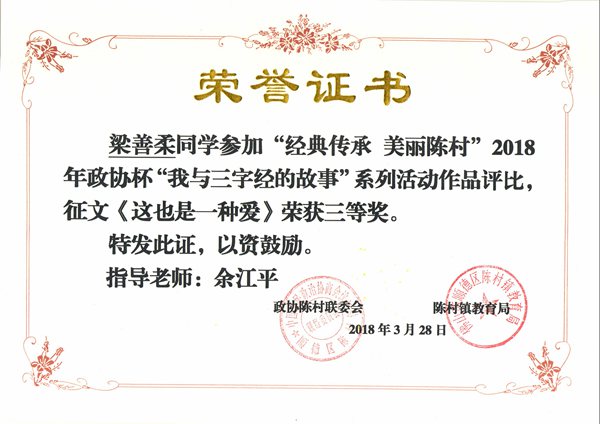 梁善柔同学获陈村镇2018年政协杯“我与三字经的故事”征文比赛三等奖