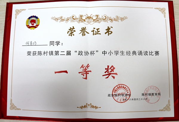 何青巧同学荣获陈村镇第二届“政协杯”中小学生经典诵读比赛一等奖!