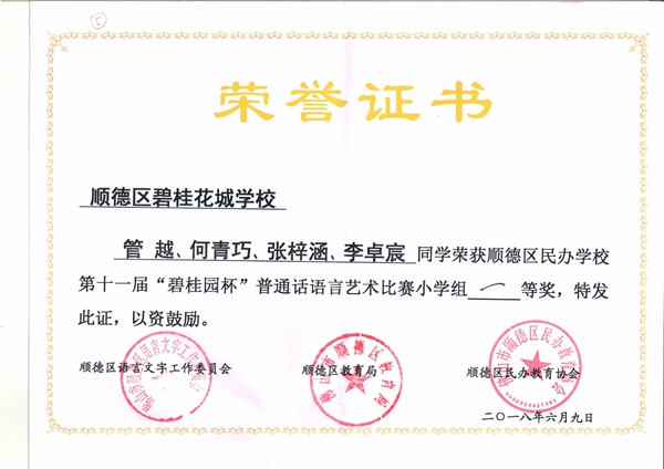 管越、何青巧、张梓涵、李卓宸四位同学荣获顺德区民办学校第十一届“碧桂园杯”普通话语言艺术比赛创作一等奖!