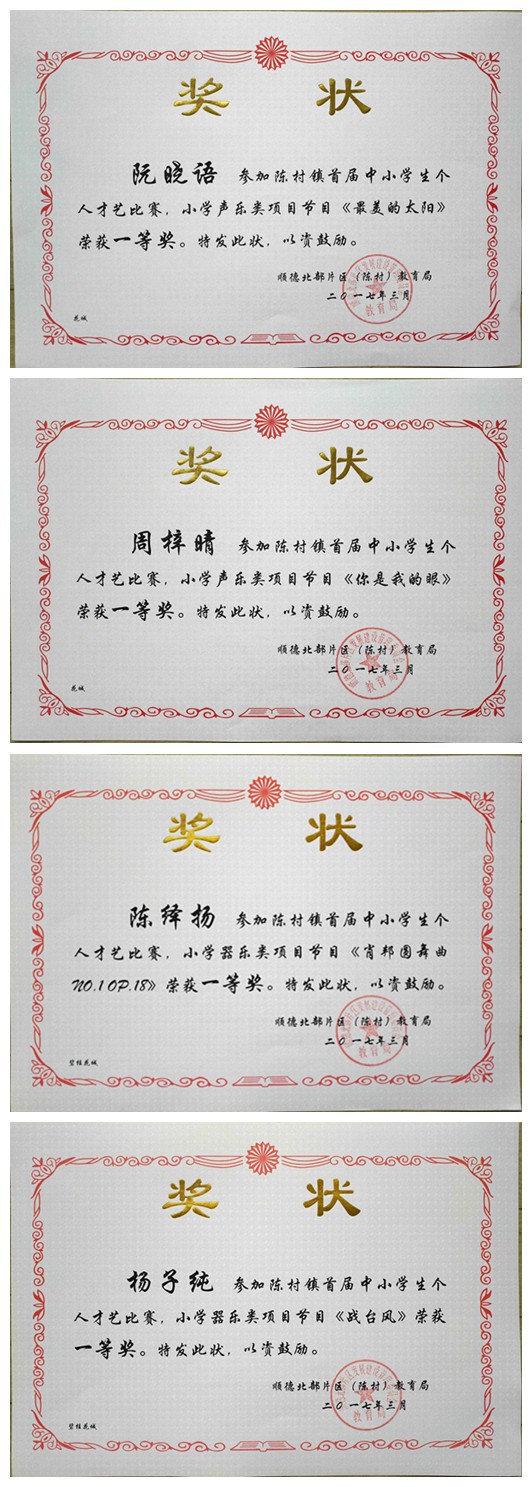阮晓语、周梓晴、陈绎扬、杨子纯四位同学在陈村镇首届中小学生个人才艺小学声乐类比赛中荣获一等奖!