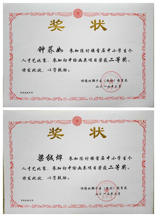 钟荞如、梁铖烨两位同学在陈村镇首届中小学生个人才艺初中绘画类比赛中荣获二等奖!