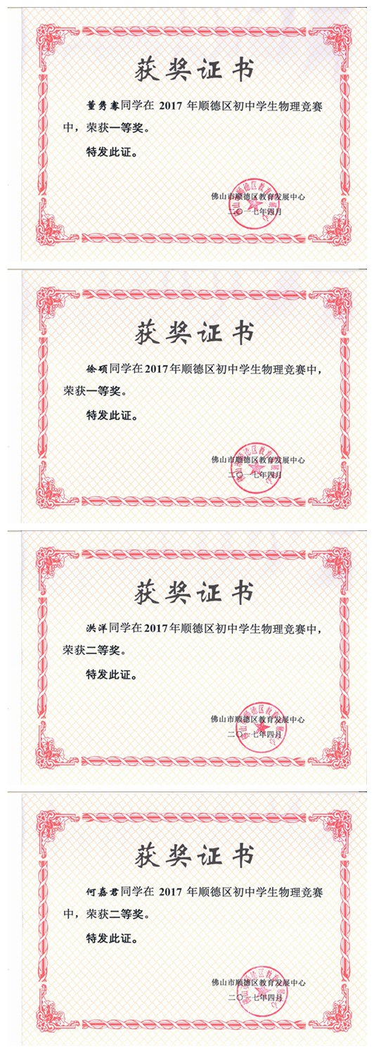 董隽骞、徐硕两位同学在2017年顺德区初中学生物理竞赛中荣获一等奖,洪洋、何嘉君两位同学荣获二等奖!