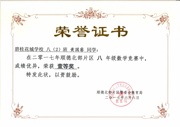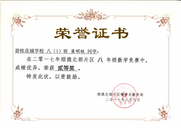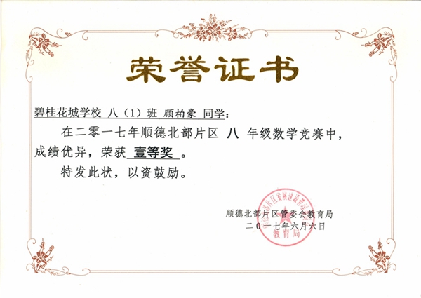 顾柏豪、黄国睿、杨帆同学在顺德北部片区数学竞赛活动中荣获一等奖!潘景锡、梁明锐、罗梓恩同学获二等奖!