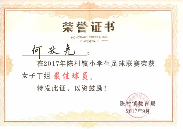 何孜尭同学在2017年陈村镇小学生足球联赛中获最佳球员!