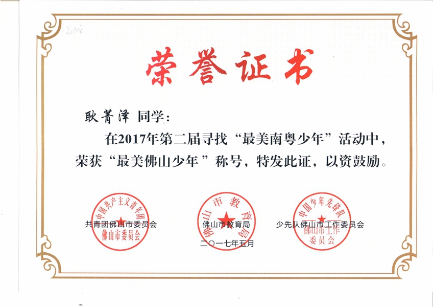 耿菁泽同学荣获“最美佛山少年”称号!