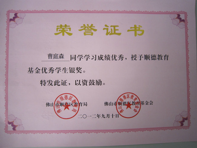 曹庭森同学被评为顺德教育基金优秀学生银奖