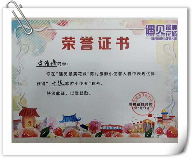 梁倩婷同学在陈村镇小学生“旅游小使者”挑战赛中荣获“十佳旅游小使者”称号