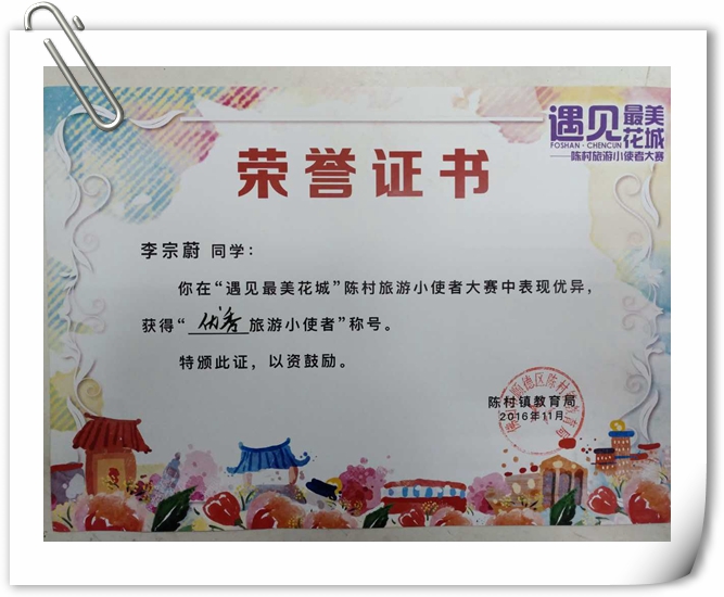 李宗蔚同学在陈村镇小学生“旅游小使者”挑战赛中荣获“优秀旅游小使者”称号