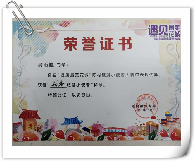 吴雨瞳同学在陈村镇小学生“旅游小使者”挑战赛中荣获“优秀旅游小使者”称号