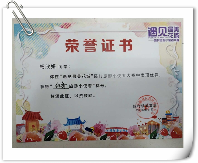 杨欣妍同学在陈村镇小学生“旅游小使者”挑战赛中荣获“优秀旅游小使者”称号